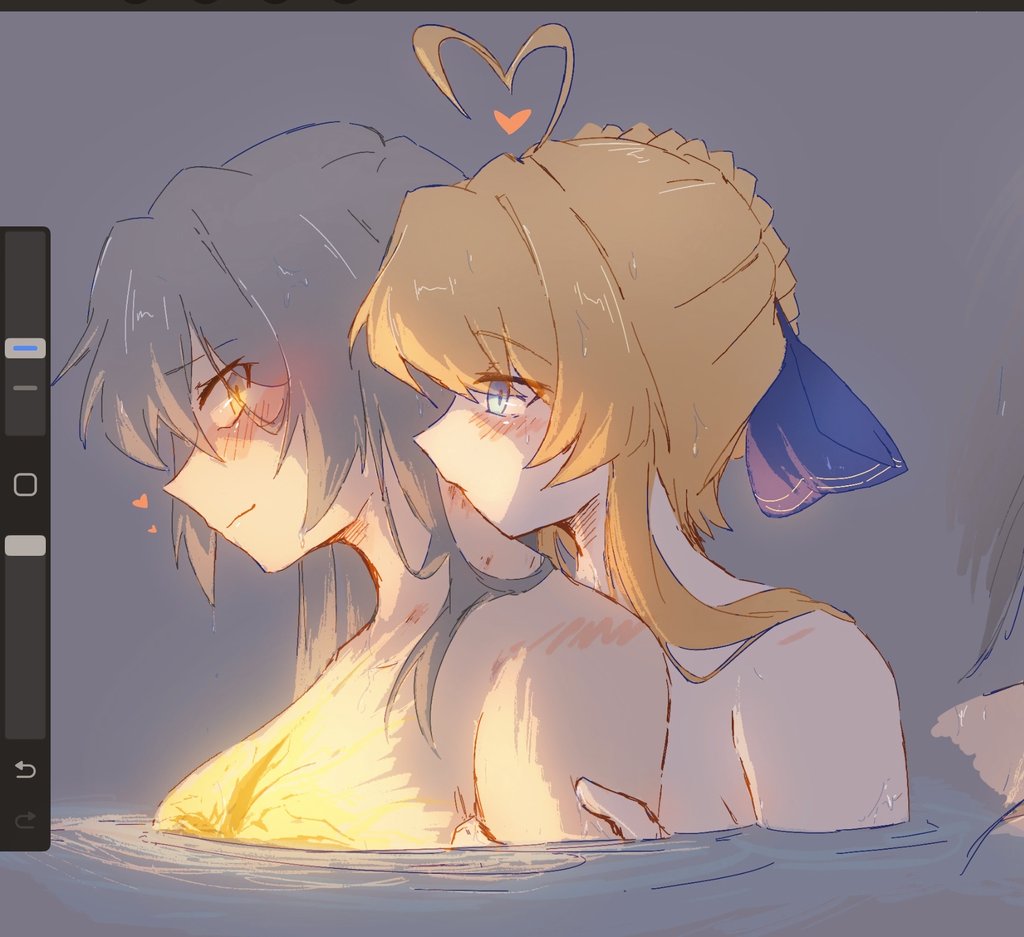 2girlsahogeart program in frameblonde hairblue eyesblue ribbongrey backgroundgrey hairhand on another's armheartheart ahogehickeykisskissing necklong hairmultiple girlsnudepartially submergedribbonsame-sex bathingshared bathingsimple backgroundyellow eyesyuri