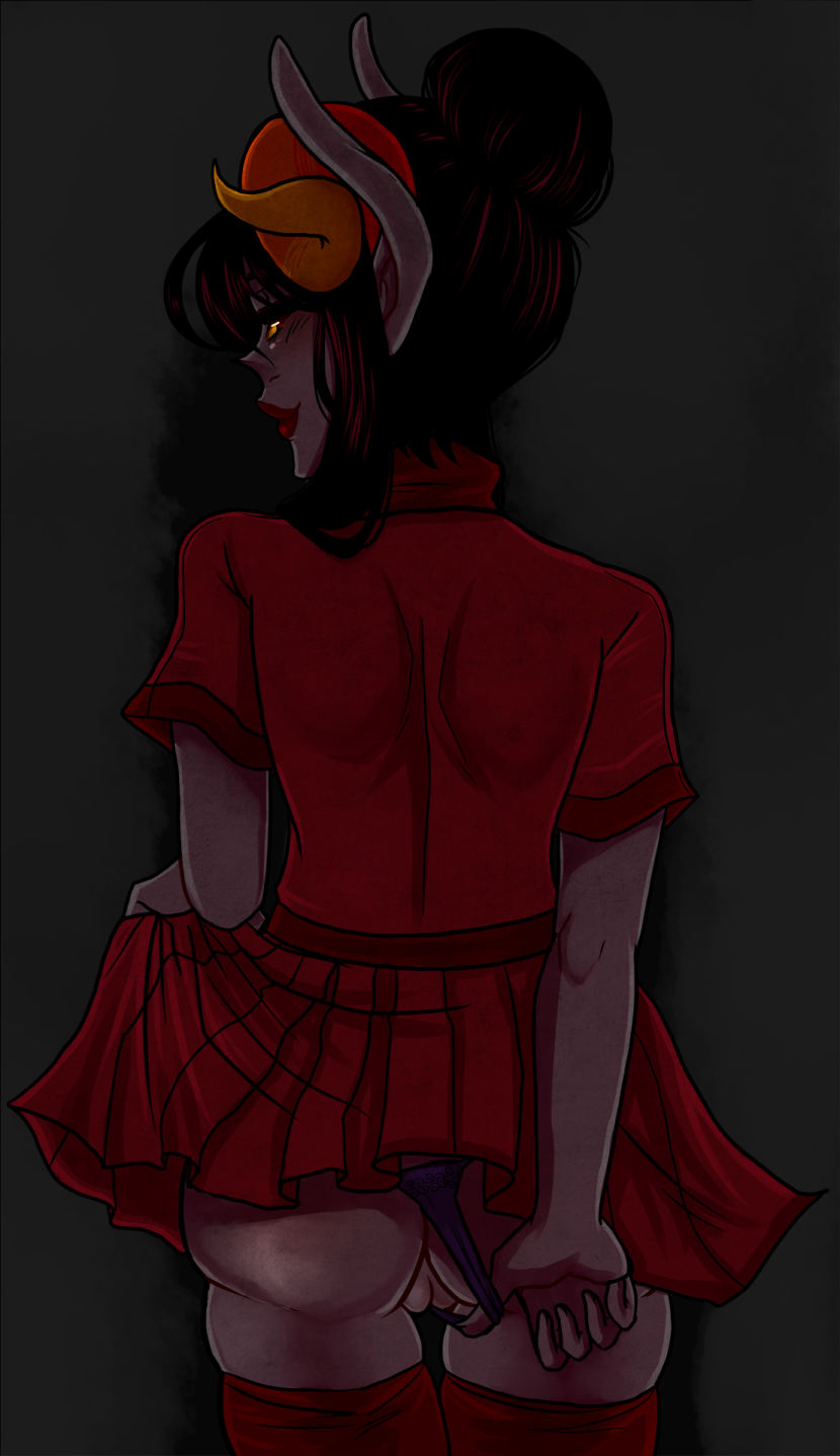 brown hairclothingfemaleFlag for Deletionhorninvitinglipsticklong hairlooking at viewerlooking backno pantiesno underwearpantiespanties asidepresentingpresenting hindquarterspussyskirtskirt liftsmilesolothighhighstrollunderwearyellow eyes