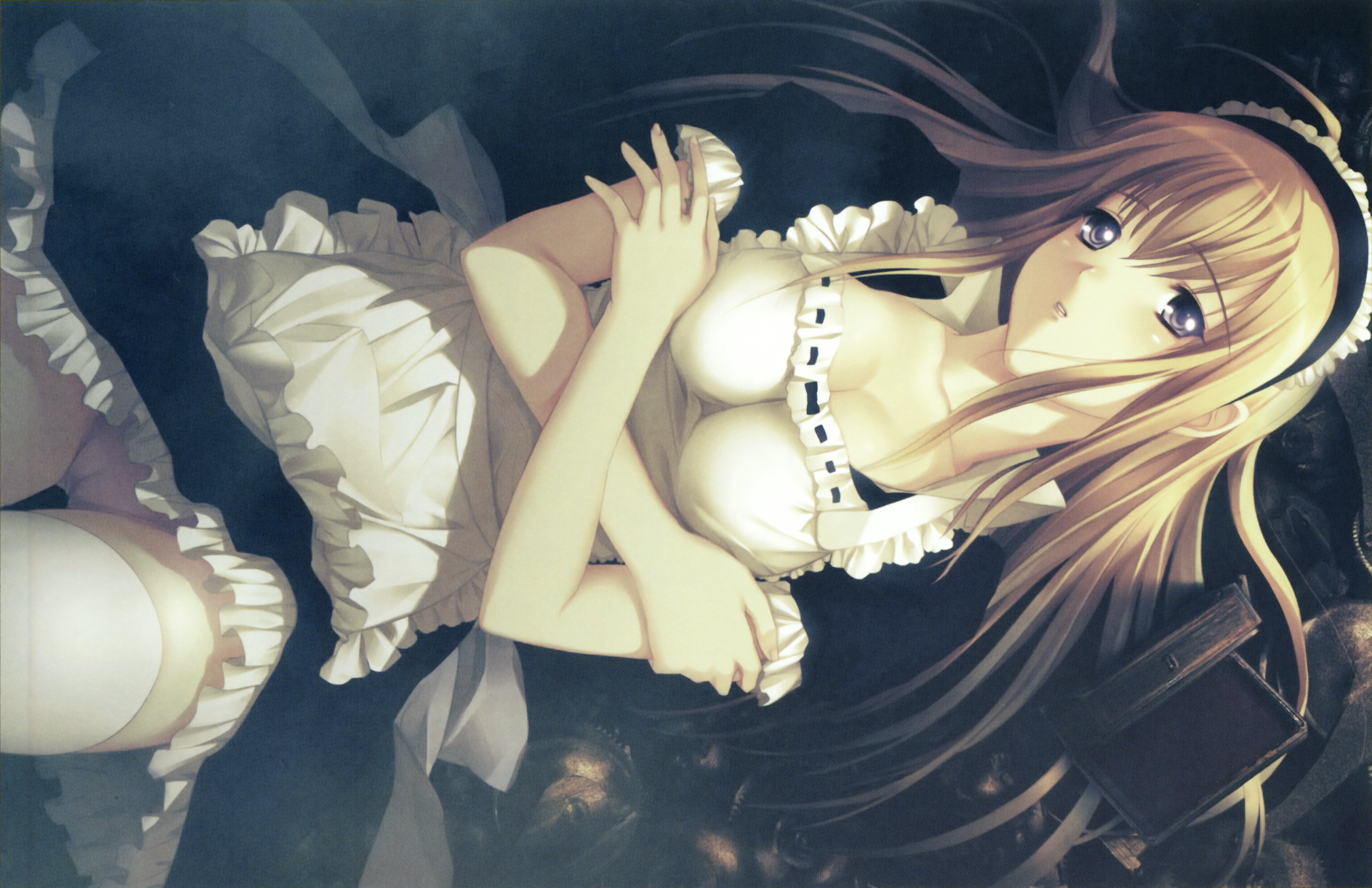 bandabekken, artoria pendragon (fate), izumi konata, saber (fate), fate/stay night, fate (series), lucky star, 00s, 2girls, apron, bronze parrot, chocolate cornet, crossover, food, katana, kobeya uniform, mole, mole under eye, multiple girls, pantyhose, plaid apron, plaid clothes, sword, waitress, weapon