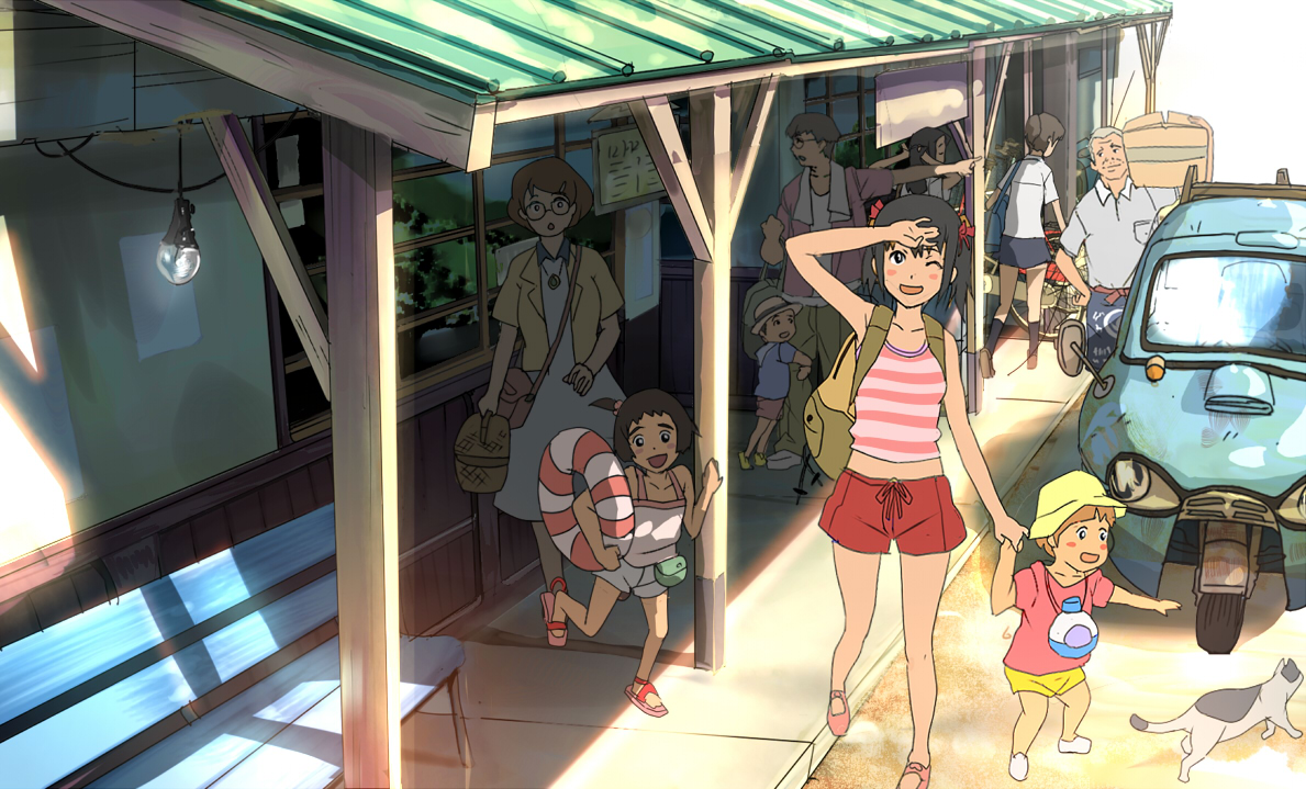 4boys4girlsanimalbackpackbagblack haircamisolecatchilddayglasseshair ribbonhatinnertubemultiple boysmultiple girlsrandoseruribbonshading eyesshortsslice of lifesummerswim ring