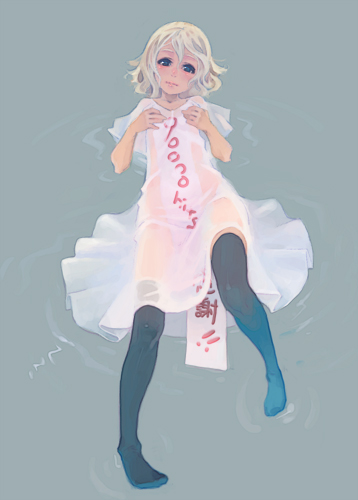 1girlblonde hairblue eyesfemale focusfull bodymilestone celebrationsee-through clothessimple backgroundsockssolothighhighswet