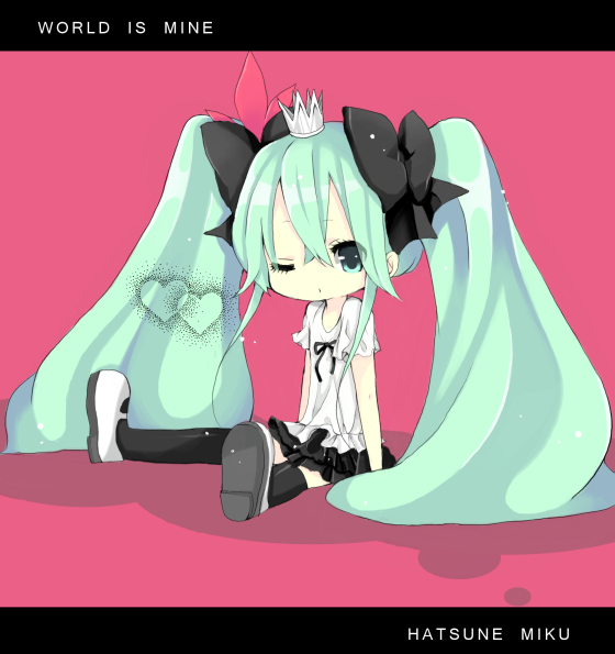 aqua eyesaqua hairchibicrownhair ribbonlong hairone eye closedribbonshoessittingskirtsolothighhighstwintailswink