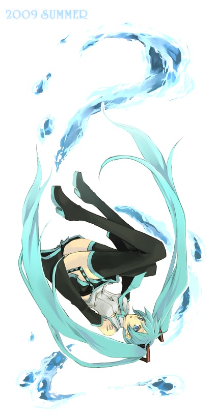 1girlaqua eyesaqua hairdetached sleevesfallingfemale focuslong hairnecktiepantiesskirtsolothighhighstwintailsunderwearvery long hair