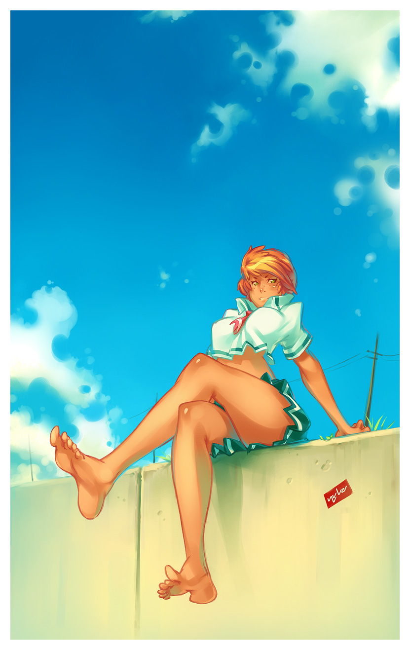 1girlbarefootbreastsfeetfemale focusfrecklesfull bodygrassgreen eyesorange hairoutdoorsschool uniformshort hairsittingskysolessolospread toestoes