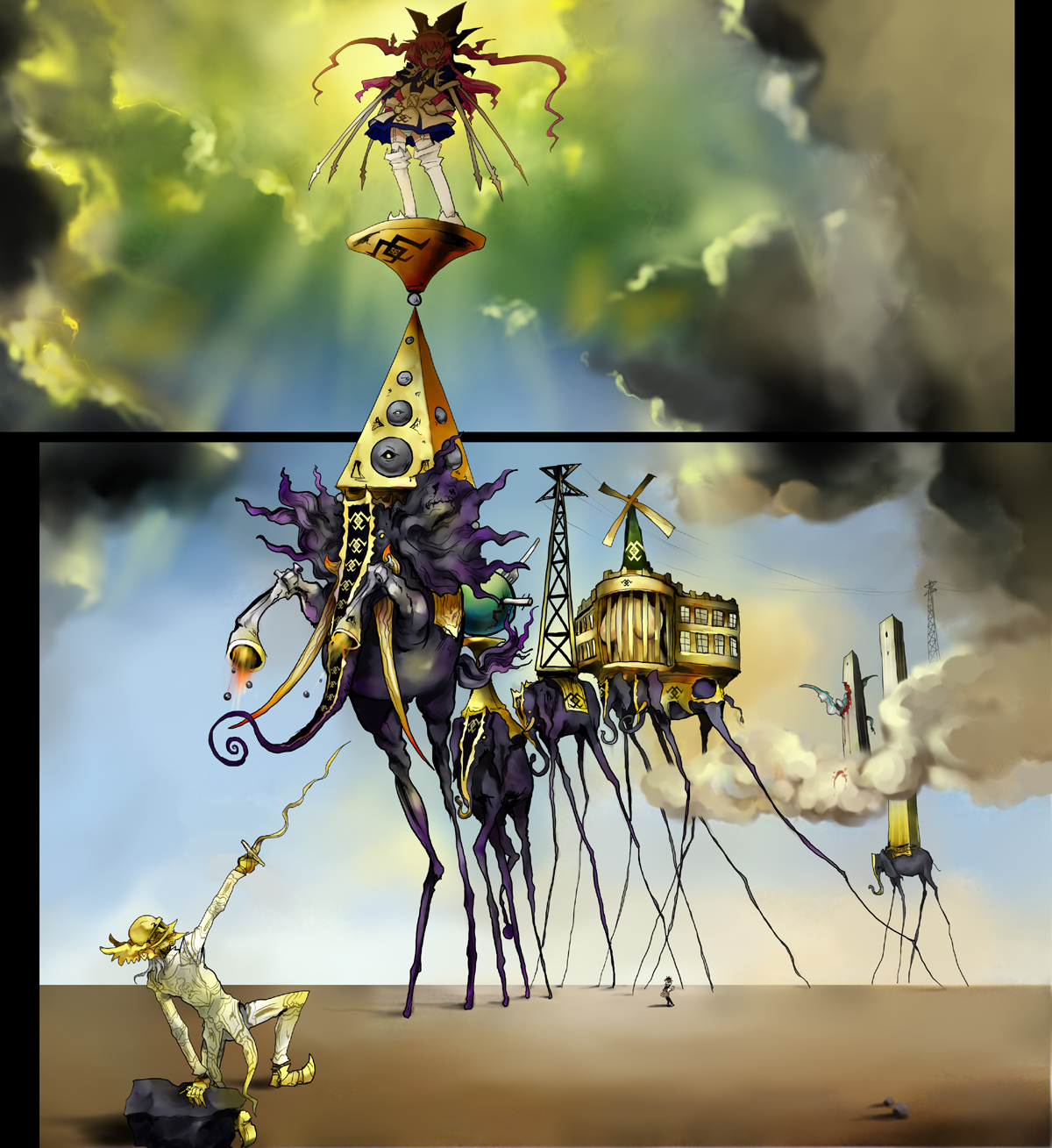 :d1boy2girlsarm cannonbloodbreastsbuildingcarryingclosed eyesclouddaydragonelephantfine art parodyforkgunhandgunhands on own hipshathelmethorizonlong hairmultiple girlson one kneeopen mouthorbpantiesparodypink hairpower linesrevolverskysmilesurrealswordthighhighsunderwearweaponwindmillzettai ryouiki