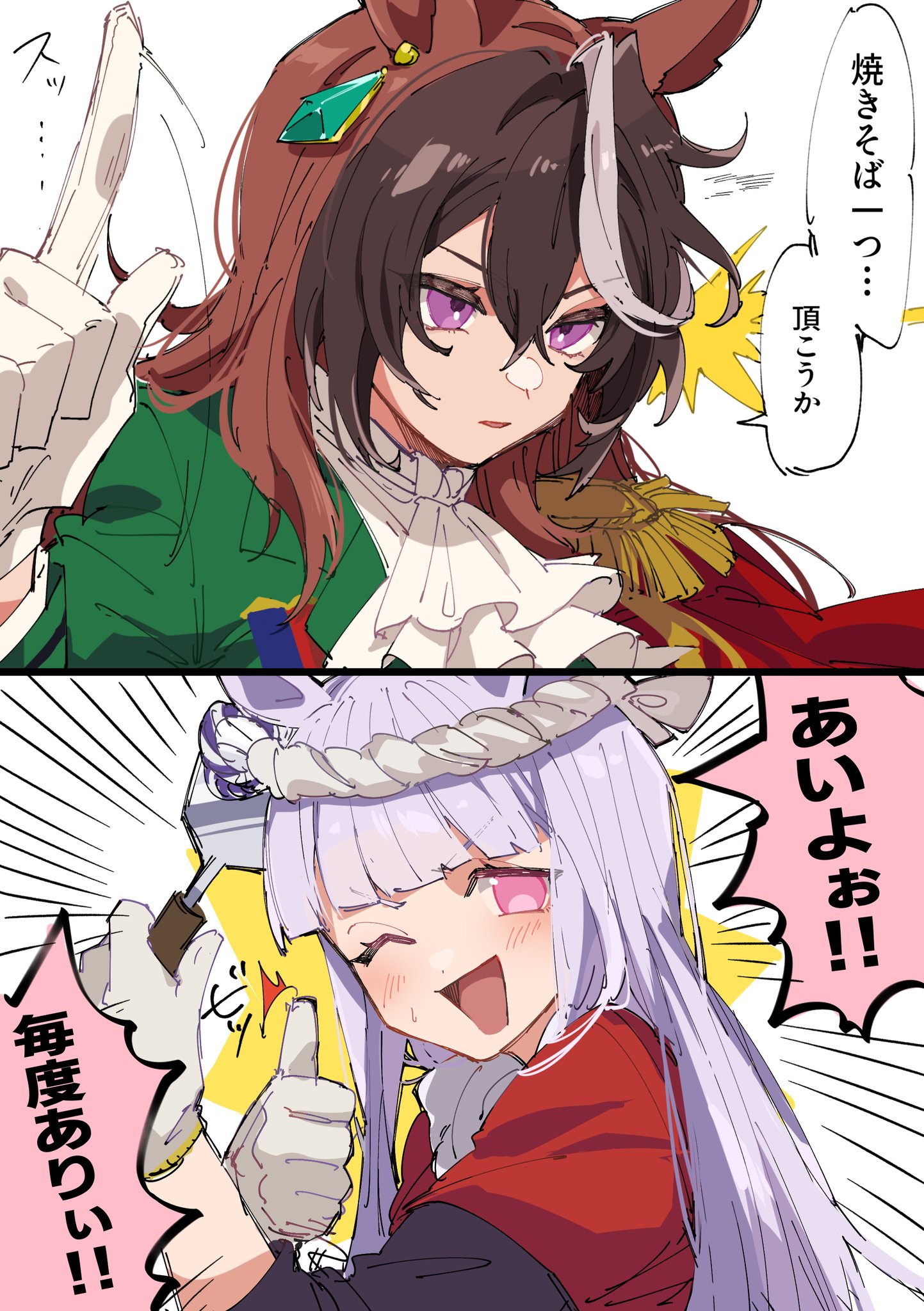 2girlsanimal earsascotbrown hairemphasis linesepauletteshair between eyeshorse earshorse girlindex finger raisedlong hairmulticolored hairmultiple girlsopen mouthparted lipspink eyespurple eyesspeech bubblestreaked hairwhite ascotwhite hair