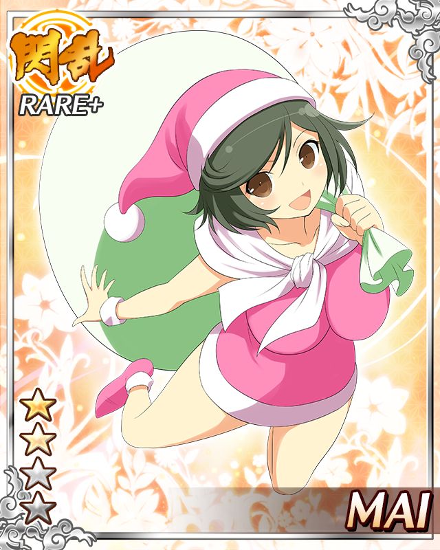 1girlblack hairbootsborderbreastsbrown eyescard (medium)character namechristmasdressenglish textfur trimfur-trimmed bootshatlarge breastsofficial alternate costumered bootssacksanta costumesanta dresssanta hatshort hairsoloswept bangswristband