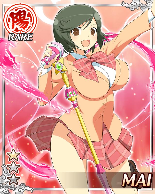 1girlaurablack hairblazerborderbowbreastsbrown eyescard (medium)character nameclothes liftenglish textjacketlarge breastsloaferslong sleevesmicrophonemicrophone standofficial alternate costumeopen mouthplaid clothesplaid skirtpleated skirtschool uniformshoesshort hairskirtskirt liftsockssoloswept bangs