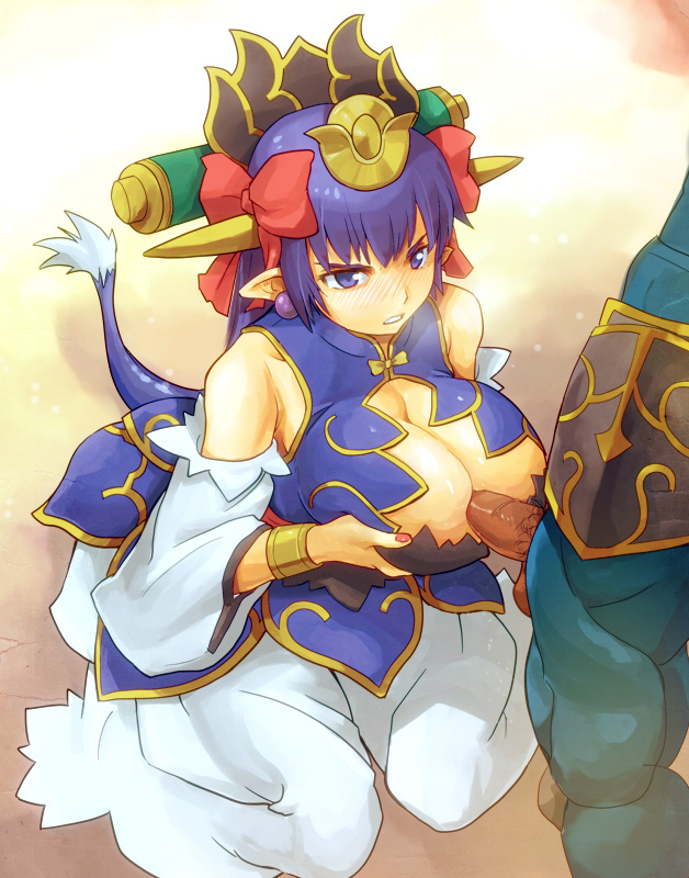 1girlblushbreastscleavageearringsgrabbing another's breastgropinghuge breastsjewelrykneelinglong hairnail polishpaizuripaizuri under clothespenisperpendicular paizuripointy earspurple eyespurple hairred nailssittingsolo focustailuncensored