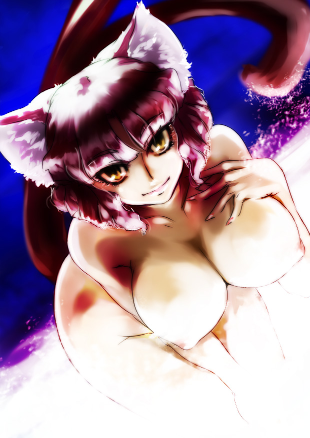 1boy1girlanimal earsbent overbetween thighsbreast suppressbreastscat earscat girlcat tailcleavagedutch angleeyelashesfemale focuship focushuge breastslarge breastslooking at viewermultiple tailsnaughty facenekomatanipplesnudepurple hairred hairslit pupilssmilesolotailv-shaped eyebrowsyellow eyes