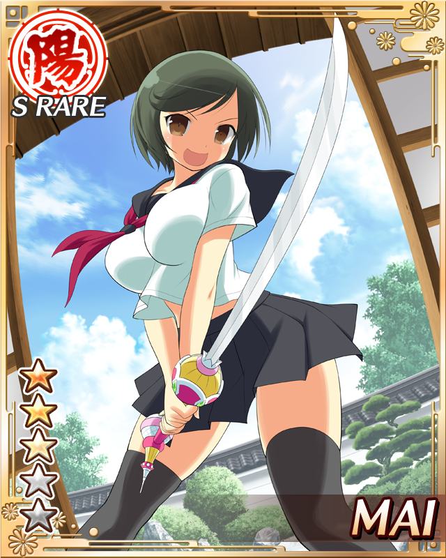 :d1girlarchitectureblack hairblack sailor collarblack skirtblack thighhighsbonsaiborderbreastsbrown eyescard (medium)character nameeast asian architectureenglish textholdingholding swordholding weaponlarge breastslooking at viewerneckerchiefofficial alternate costumeopen mouthpleated skirtred neckerchiefrock gardensailor collarshirtshort hairskirtsmilesoloswept bangsswordthighhighsweaponwhite shirt