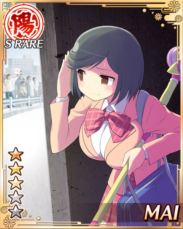 1girlbagblack hairborderbowbowtiebreastsbrown eyescard (medium)character nameclosed mouthcrowdenglish textfrownhidingholdingholding swordholding weaponjacketlarge breastsofficial alternate costumeorange jacketplaid bowplaid bowtieplaid clothesplaid skirtred bowred bowtiered skirtschool bagschool uniformshirtshort hairskirtsoloswept bangsswordweaponwhite shirt