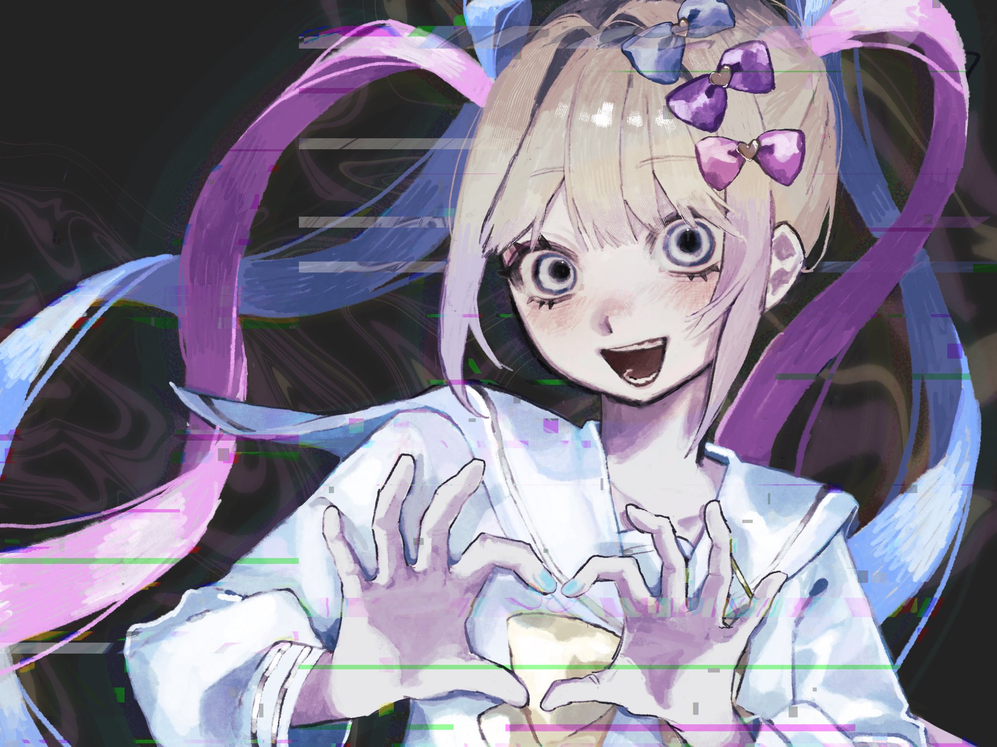 :d1girlblack backgroundblonde hairblue bowblue eyesblue hairblue shirtbowcrazy eyeseir (eiriiiiii)glitchhair bowhands upheartheart handslong hairlong sleeveslooking at viewermulticolored hairopen mouthpink bowpink hairpurple bowquad tailssailor collarshirtsmilesoloupper bodywide-eyed