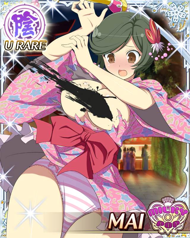 :o1girlblack hairblushborderbreastsbrown eyescard (medium)character nameconvenient censoringenglish textfestivalfloral printfloral print kimonohair ornamentholdingholding swordholding weaponinkjapanese clotheskimonolarge breastslooking downnightno braofficial alternate costumepantiespink kimonopink pantiesprint kimonoshort hairsolostriped clothesstriped pantiesswept bangsswordtorn clothestorn kimonounderwearweapon