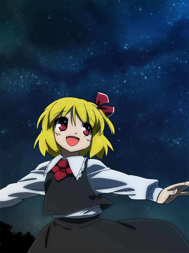 1girlblonde hairfemale focushair ribbonnightnight skyoutdoorsred eyesribbonshort hairskysolostanding