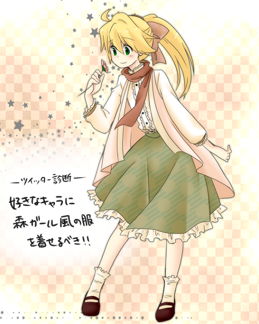 1girlahogealternate costumeblonde hairblushbowbrown shoesclosed mouthflowerfull bodygreen eyesgreen skirthair bowholdingholding flowerlong hairlong sleevesmori keipink bowpink flowerponytailred scarfscarfshirtshoesskirtsmilesockssolostandingstar (symbol)white shirtwhite socks