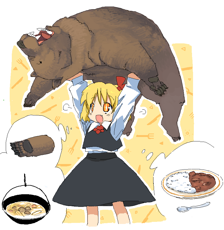 1boy1girlanimalbearblonde haircarryingcarrying overheadfangfemale focusfoodhair ribbonoekakiribbonsolospoonyellow eyes