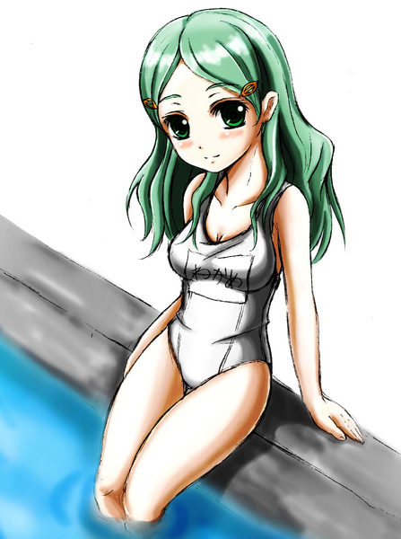 00sgreen eyesgreen hairhair ornamenthaircliplong hairone-piece swimsuitpoolpoolsideschool swimsuitsoloswimsuitwhite one-piece swimsuitwhite school swimsuit