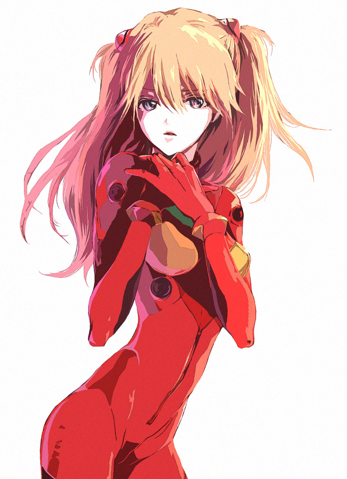 :o1girlblue eyesbodysuitbracerbreastscowboy shotfemale focusfrom sidegloveshair between eyeshair ornamenthand on own chestlong hairlooking at viewermecha pilot suitopen mouthorange hairown hands togetherplugsuit (evangelion)red hairsimple backgroundskinnysmall breastssoloturtleneckwhite background