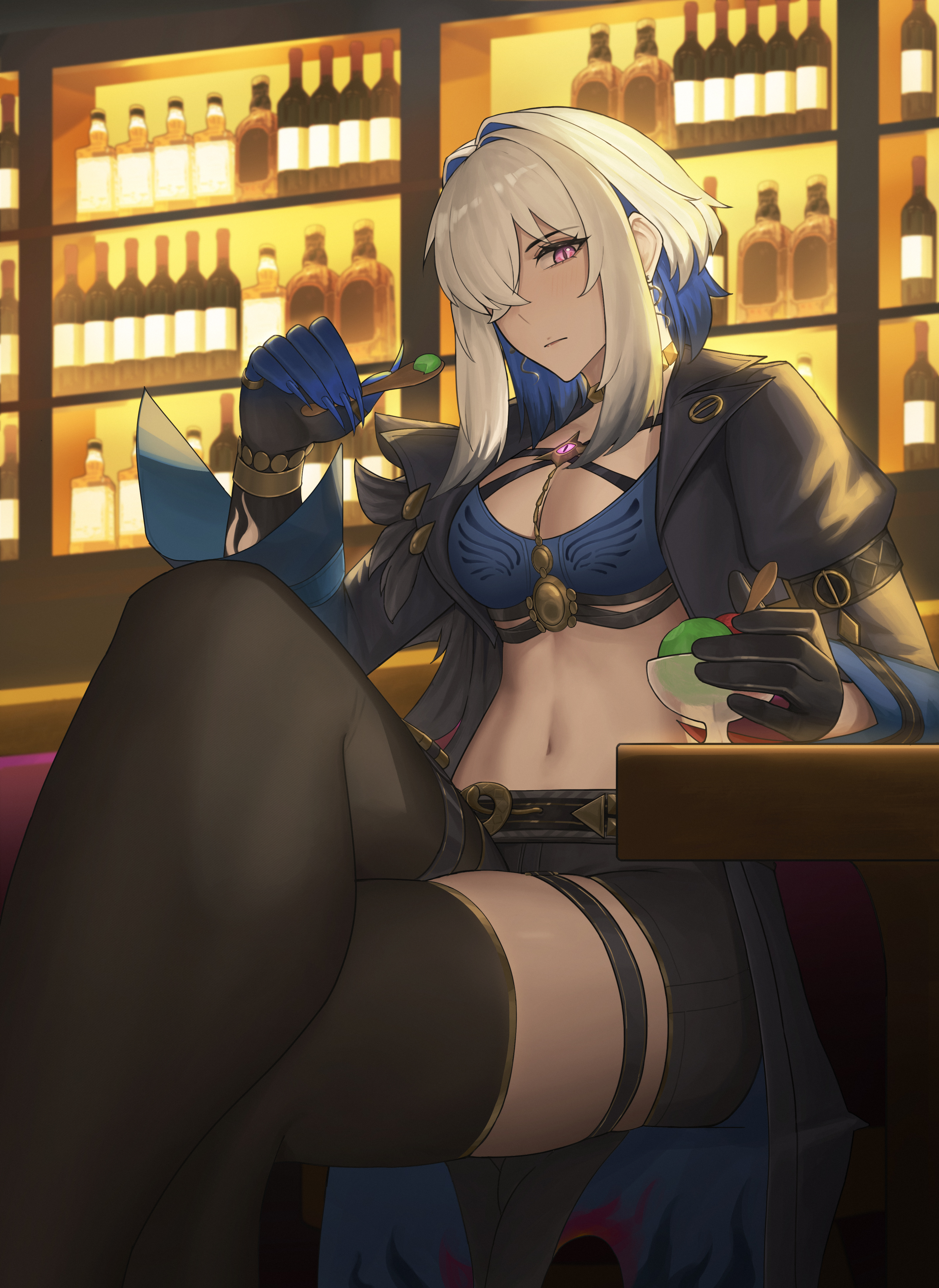 1girlblack pantyhoseblack shortsblack thighhighsblue brablue hairbrabreastsclosed mouthcolored inner haircrossed legsearringshand upholdingholding spoonjewelrylooking at viewermedium breastsmedium hairmulticolored hairnavelpantyhosepurple eyesshortssingle leg pantyhosesingle thighhighsolospoonstomachthighhighsthighsunderwear