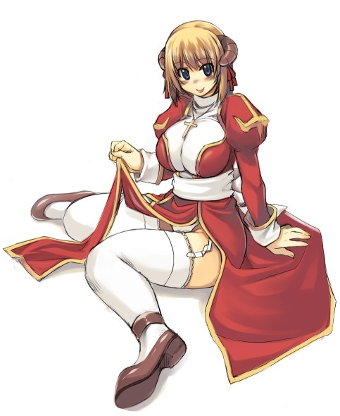 1girlblonde hairblue eyesblushbreastsclothes liftcrossdressdress liftfemale focusgarter belthornsjewelrylarge breastsloinclothnecklacepantiesshort hairsimple backgroundsittingsolothighhighsturtleneckunderwearwhite backgroundwhite pantieswhite thighhighszettai ryouiki