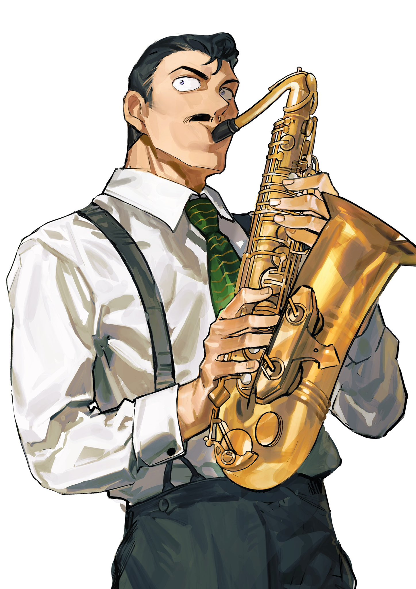 1boyblack pantscollared shirtfacial hairgreen necktieholdingholding instrumentholding saxophoneinstrumentmature malemusicmustachenecktiepantsplaying instrumentsaxophoneshirtsolosuspendersupper bodywhite backgroundwhite shirt