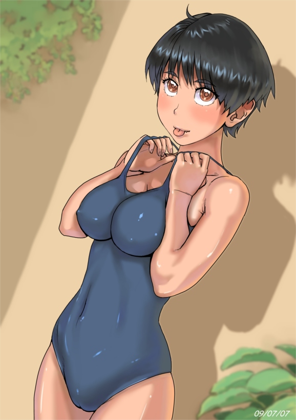 :p1girlarms upblack eyesblushbreastsbreasts squeezed togetherbrown eyescameltoecovered erect nipplescovered naveldateddutch anglefemale focuslooking at viewerone-piece swimsuitshadowshiny clothesshiny skinshort hairskin tightskindentationsolostandingswimsuittonguetongue outyellow background