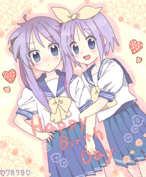 tetsu (kimuchi), yumizuka satsuki, tsukihime, 00s, 1girl, birthday, fang, female focus, kneehighs, school uniform, serafuku, socks, solo, sweater, sweater vest, twintails, two side up, vest