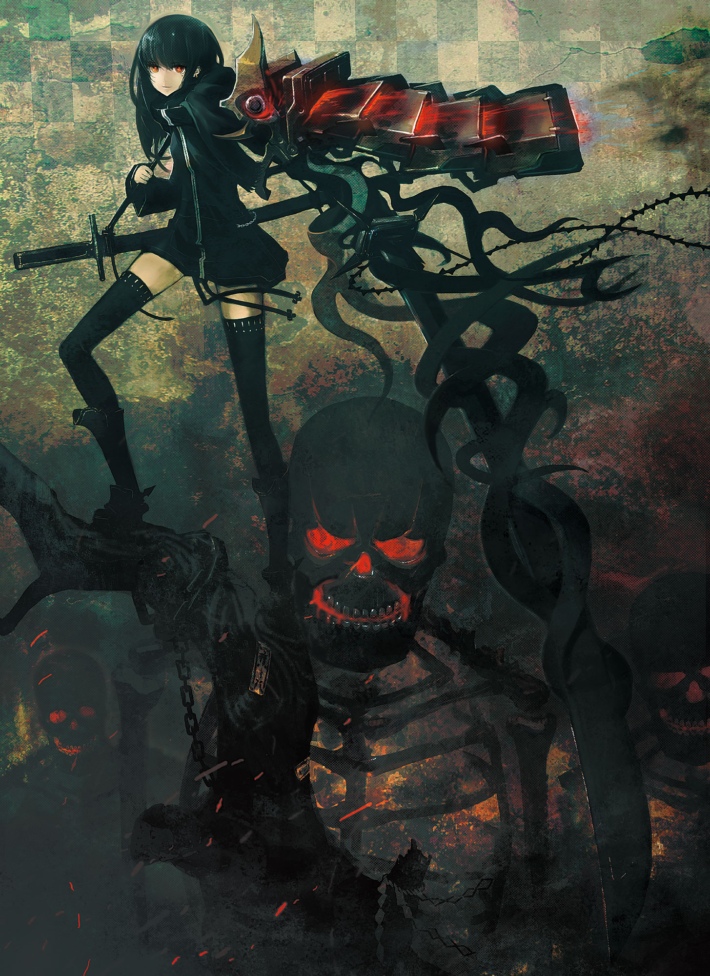 1girlblack hairblack thighhighsdarkhoodhoodielong hairmolemole under eyered eyesskeletonskullswordthighhighsweapon