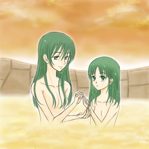 00s2girlsage differencebathbraceletgreen eyesgreen hairjewelrylong hairmother and daughtermultiple girlsnudeonsenskywetwet hair