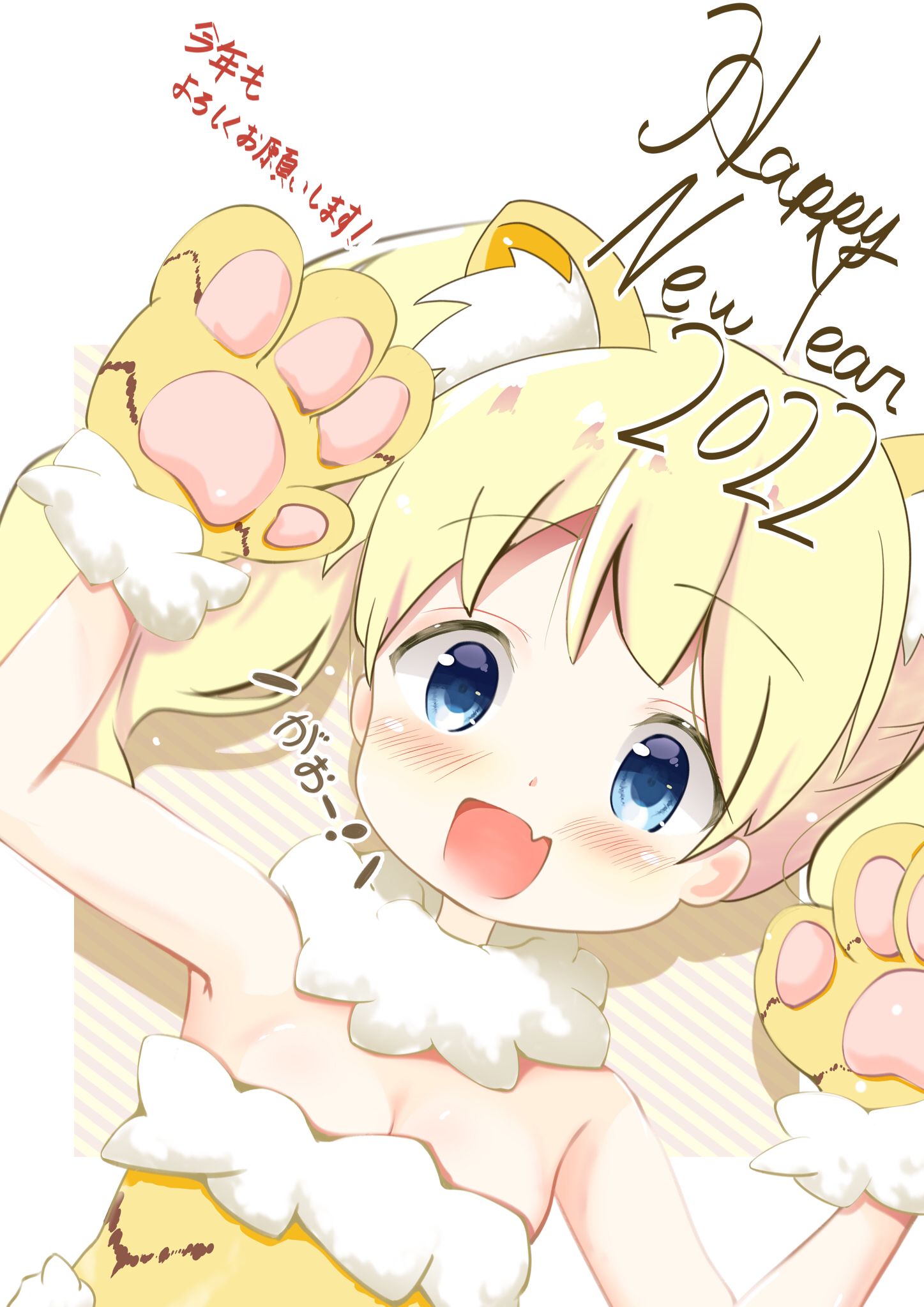 1girl2022animal ear fluffanimal earsanimal handsbare shouldersblonde hairblue eyesblushbreastscat earscleavageenglish textfanghappy new yearlooking at viewernew yearskin fangsmall breastssoloupper bodywhite background