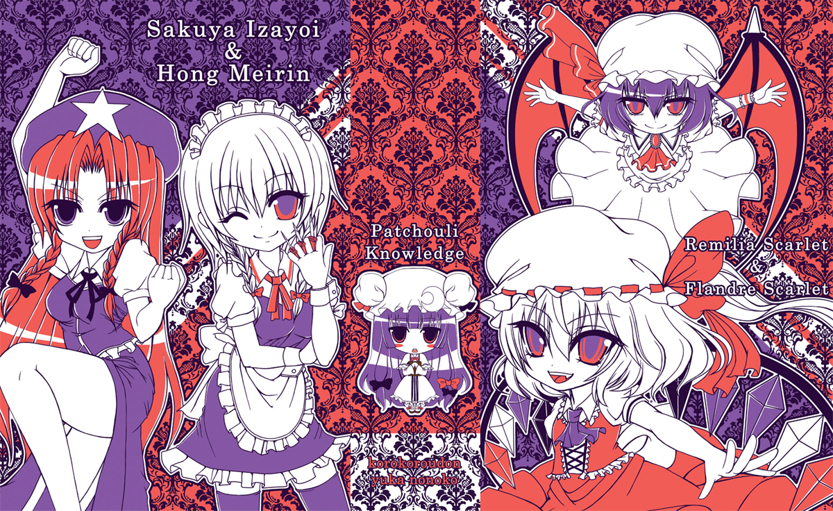 5girlsbat wingsbraidchibichina dresschinese clothescrescentcrescent hat ornamentdressfemale focushathat ornamentknifelong hairmaid headdressmob capmonochromemultiple girlsone eye closedponytailpurple themered themeshort hairside ponytailstar (symbol)star hat ornamentthrowing knifetwin braidsweaponwingswink