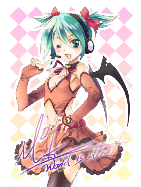1girlalternate hair lengthalternate hairstyleaqua eyesaqua hairbat wingsclothing cutoutelbow glovesfemale focusfingerless glovesgloveshair ribbonheadphonesheadsetheartheart cutoutone eye closedribbonshort hairskirtsmilesolothighhighstwintailswingswinkzettai ryouiki