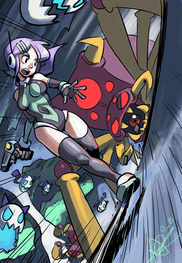 1girlbugcavechasingdutch angleelbow glovesfleeingglovesgunhair ornamenthaircliphandgunheadsetleotardlooking backmonstermotion linesopen mouthpistolpurple hairrunningsignaturespeed linesspiderthighhighsweapon