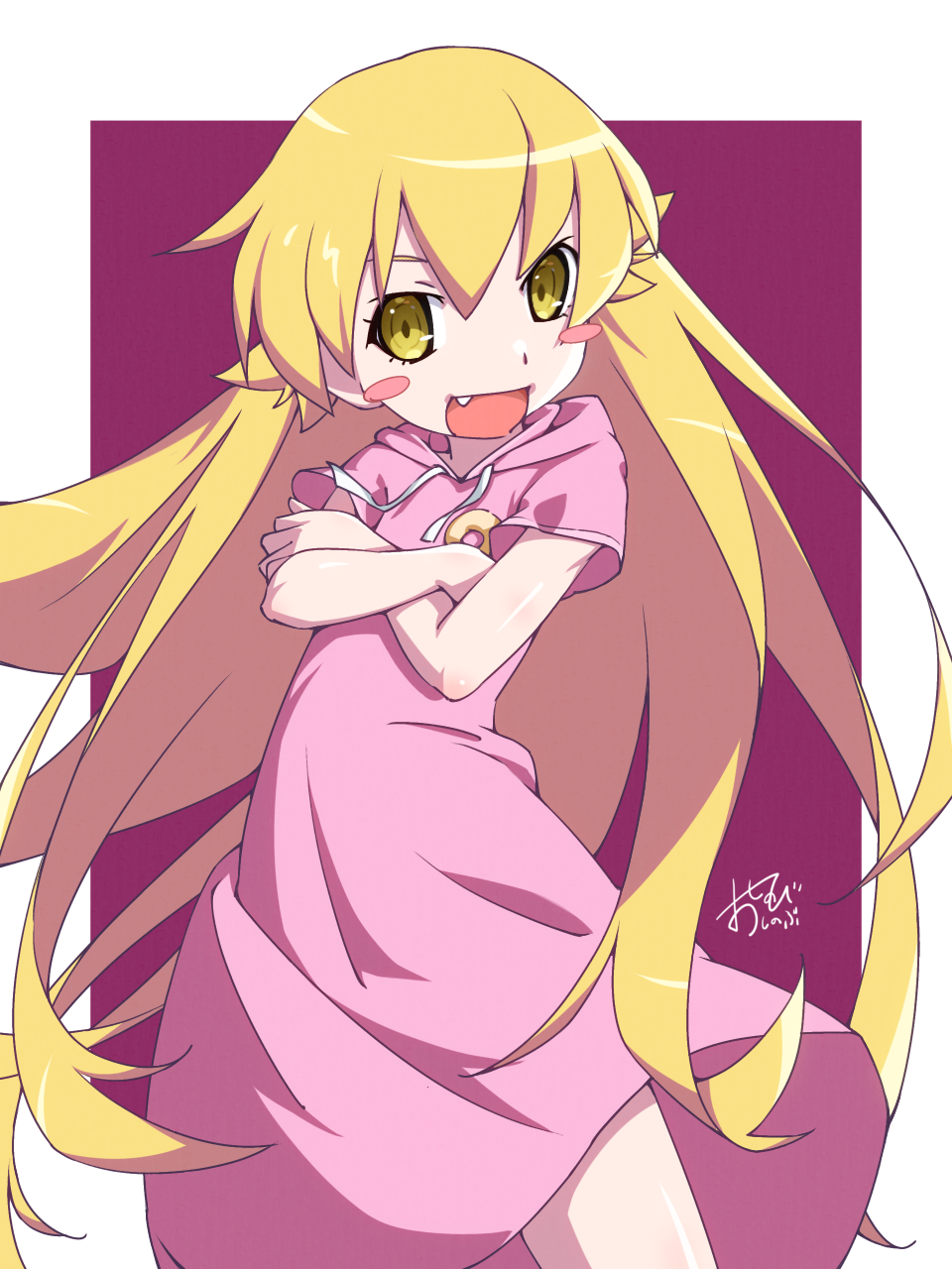 :d1girlbadgeblonde hairblush stickersborderbutton badgecowboy shotcrossed armsdrawstringdressfangflat chesthair between eyeshair flapshooded dresslong hairlooking at vieweropen mouthpink dresspointy earspurple backgroundringed eyesshiny skinshort sleevessignaturesmilesolovery long hairwhite borderyellow eyes