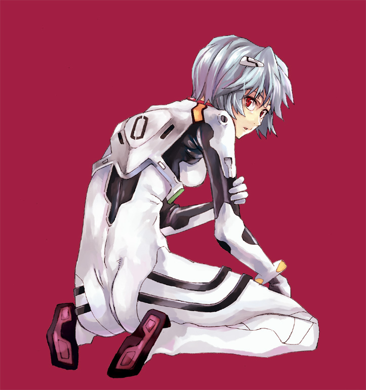 assblue hairkneelinglooking backmecha pilot suitplugsuit (evangelion)red eyesshort hairsimple backgroundsolo