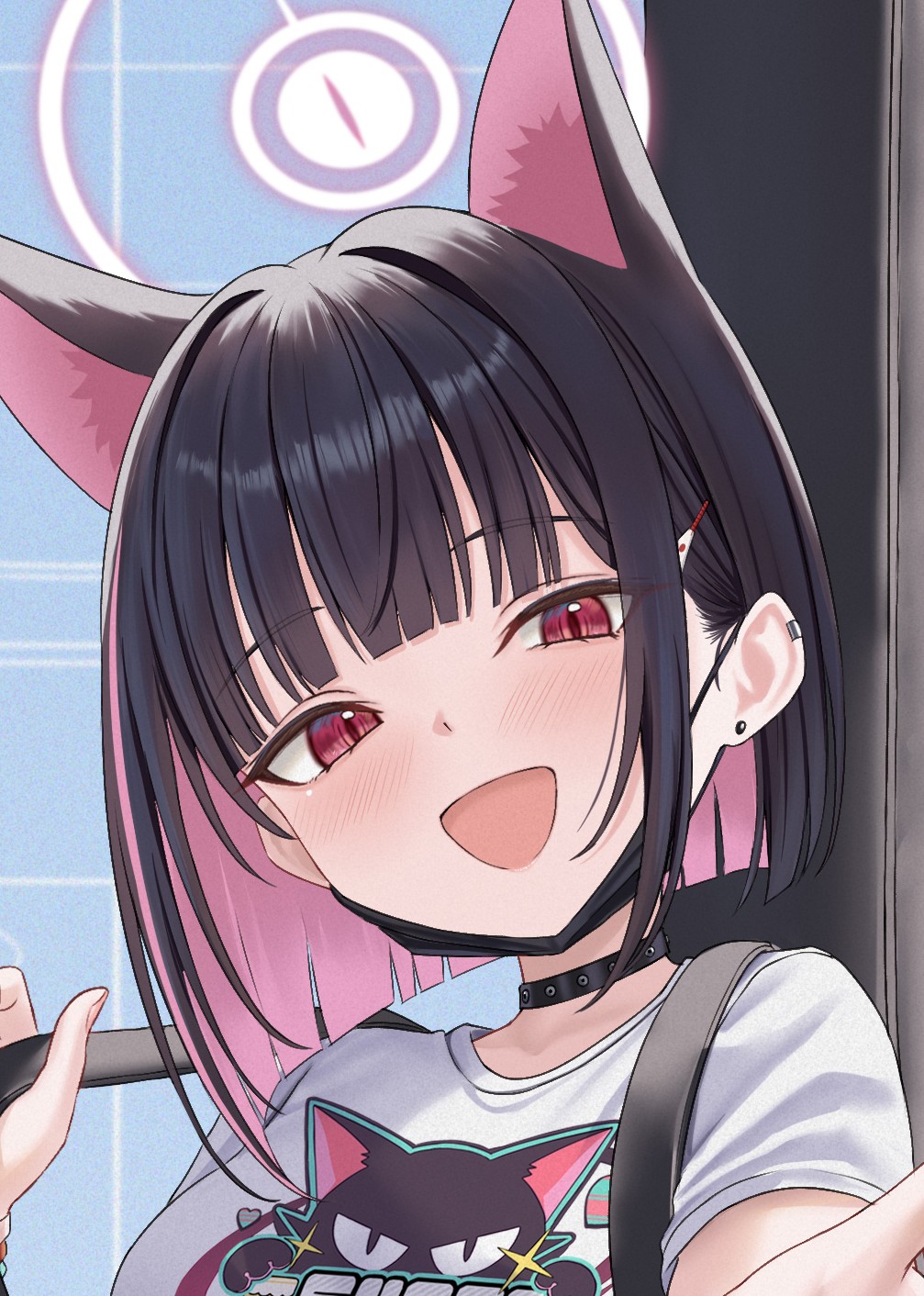 :d1girlanimal earsblack chokerblack hairblue backgroundblunt bangsblunt endsblushcat earscat girlchokercolored inner hairhalolooking at viewermulticolored hairopen mouthpink hairpink haloportraitred eyesshirtsmilesolotwo-tone hairwhite shirt