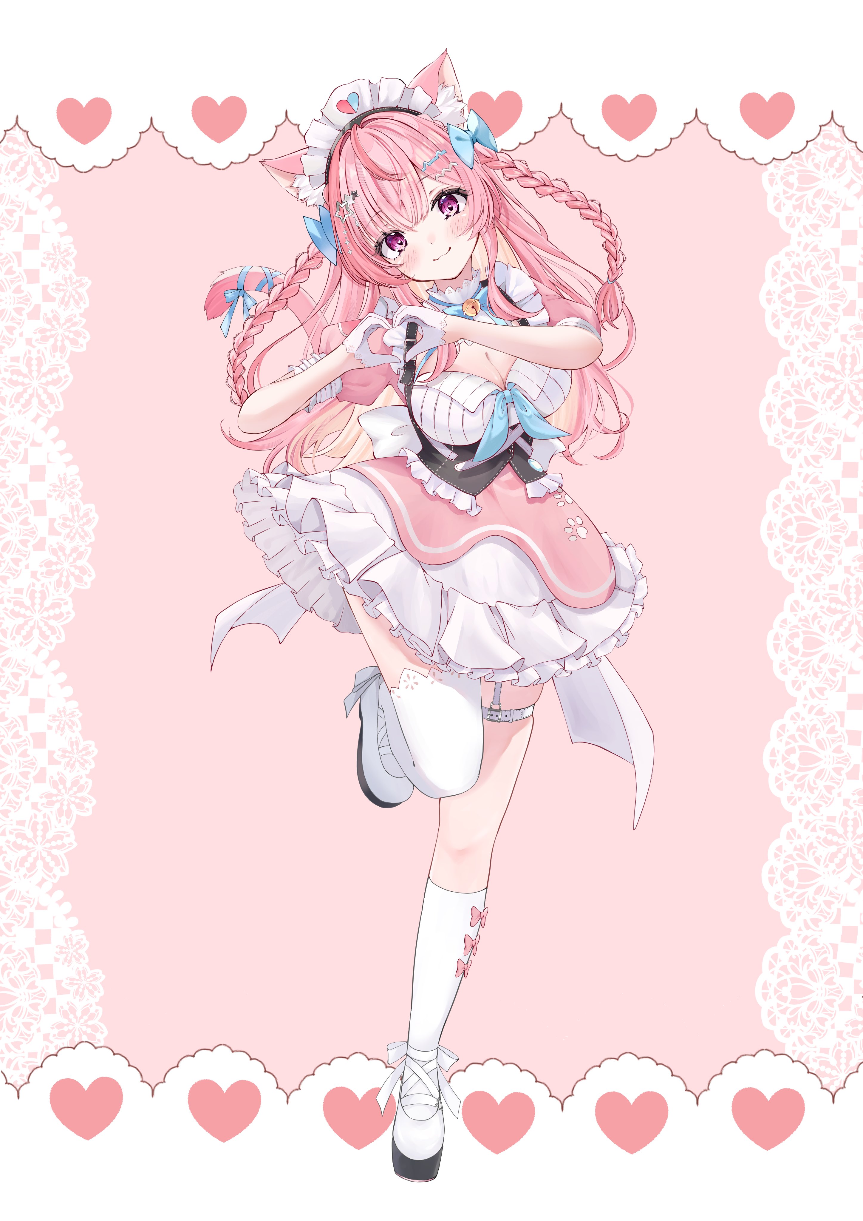 1girlanimal ear fluffanimal earsasymmetrical legwearblue bowbowbow legwearbraidbreastscat earscat girlcleavageclosed mouthdressfull bodygloveshalf glovesheartheart handskneehighslarge breastsmaid headdresspink backgroundpink bowpink dresspink hairshoesshort sleevessimple backgroundsmilesockssolostandingstanding on one legthigh strapthighhighstwin braidsuneven legwearvirtual youtuberwhite gloveswhite shoeswhite sockswhite thighhighs