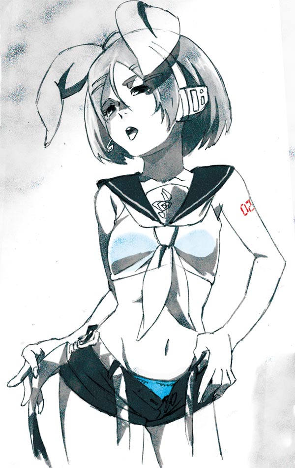 1girlbeltfemale focusgreyscalehair ornamenthair ribbonhairclipheadphonesheadsetmidriffmonochromenaughty facenavelpantiesribbonsailor collarsee-through clothesshort hairshort shortsshortssolospot colorunderwear
