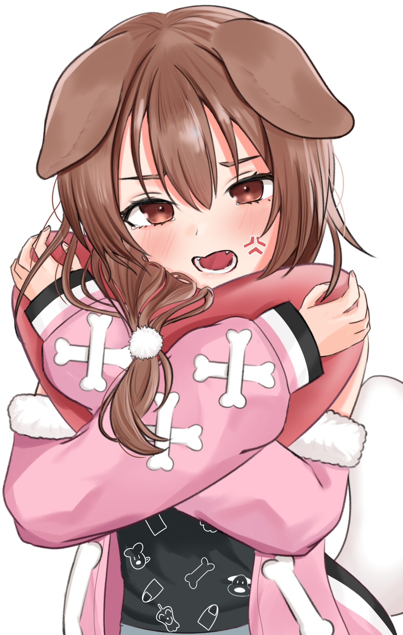 1girl2025anger veinanimal earsblack shirtblushbrown eyesbrown hairdog earsdog girldottoraheartholdingholding heartlong hairlooking at vieweropen mouthpink sweaterponytailshirtsolosweaterteethtonguevirtual youtuberwhite background