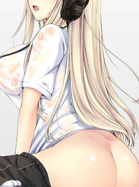 1girlassblonde hairbottomlessbreastsdimples of venusfemale focushead out of frameheadphoneshuge breastslong hairno pantiesopen mouthsee-through clothessideboobsittingsolowetwet clothes