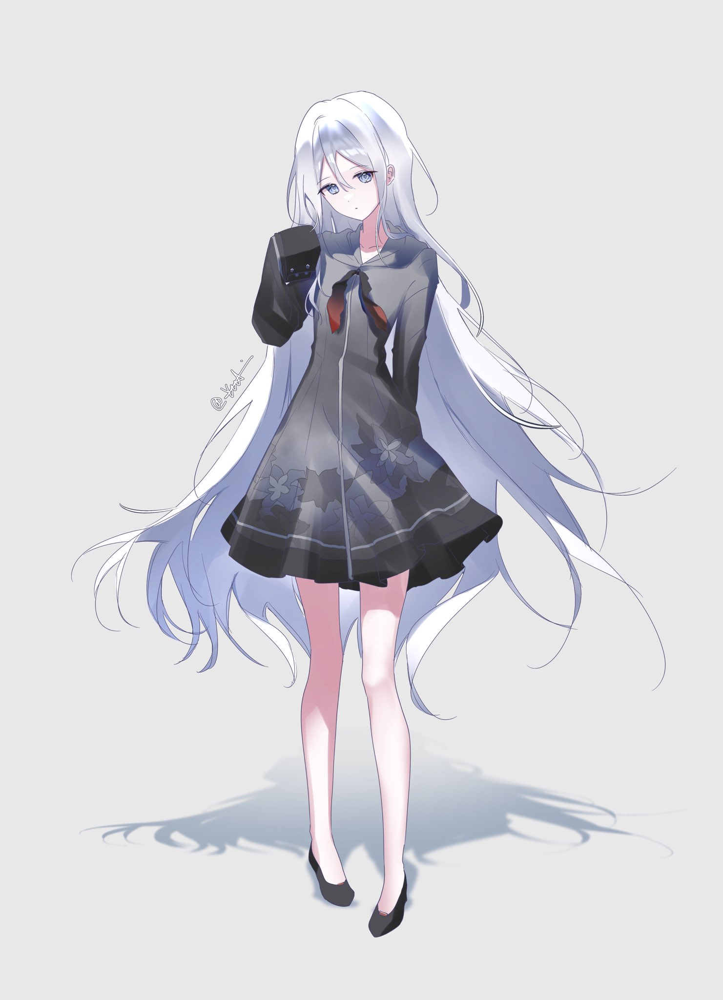 1girlarm behind backbare legsblack dressblack ribbonblack shoesblue eyesclosed mouthcollarbonedot nosedressflat chestflatsfloral printflowerfull bodygradient clothesgradient dressgradient ribbongrey backgroundgrey dresshair between eyeshand uphoodhood downhooded dresslong hairlong sidelockslong sleeveslooking at viewermessy hairpoinsettiared ribbonribbonshadowshoesshort dresssidelockssimple backgroundsleeves past fingerssleeves past wristssolostandingstraight hairtwitter usernamevery long hairwhite hairzipperzipper dress