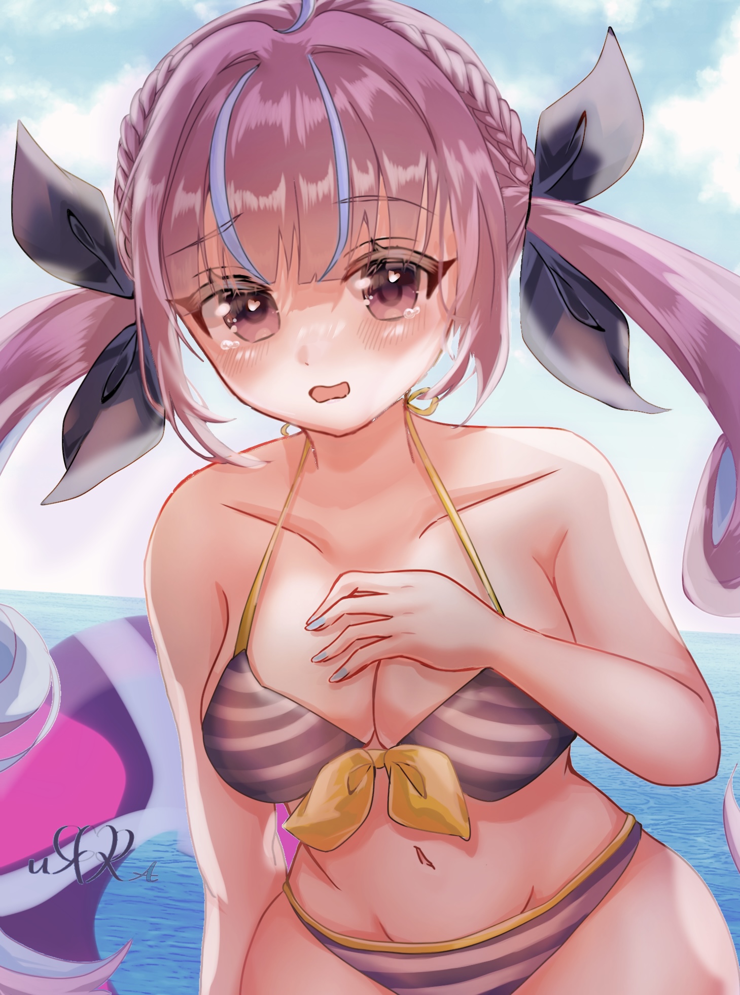 1girlbikiniblue bikiniblue skyblue streaksbraidbreastscleavagecollarbonecowboy shotdayfront-tie bikini topfront-tie tophalterneckhand on own chestlarge breastslong hairlooking at viewermulticolored hairnavelofficial alternate costumeopen mouthoutdoorspurple eyespurple hairrina xx203skysolostreaked hairstriped bikinistriped clothesswimsuittearing uptwintailsvirtual youtuber