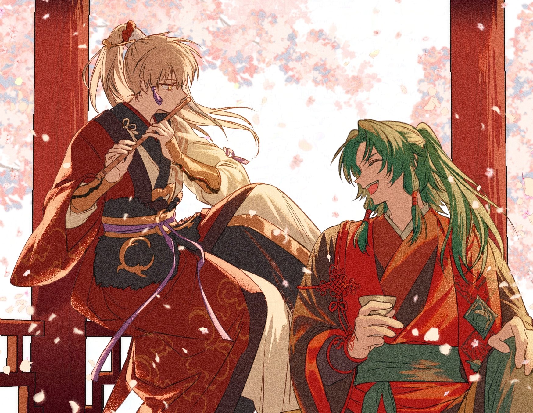 2boyschinese clotheschinese hairpinclosed eyescupfalling petalsflutegreen hairgrey hairhair ornamenthalf updohanfuhigh ponytailholdingholding cupholding fluteholding instrumentinstrumentlong hairlow-tied sidelocksmale focusmultiple boysmusicopen mouthpetalsplaying fluteplaying instrumentponytailred hanfusidelockssittingsmiletasseltassel hair ornamentxiao guan (headdress)yellow eyes