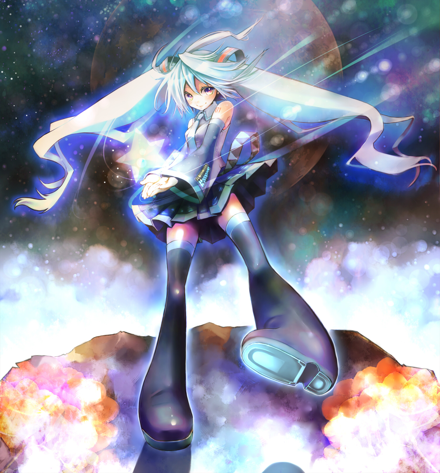 1girlblue eyesblue hairdetached sleevesfemale focusfull bodylegslong hairmatching hair/eyesnecktieskirtskysmilesolostar (symbol)thighhighstwintailszettai ryouiki