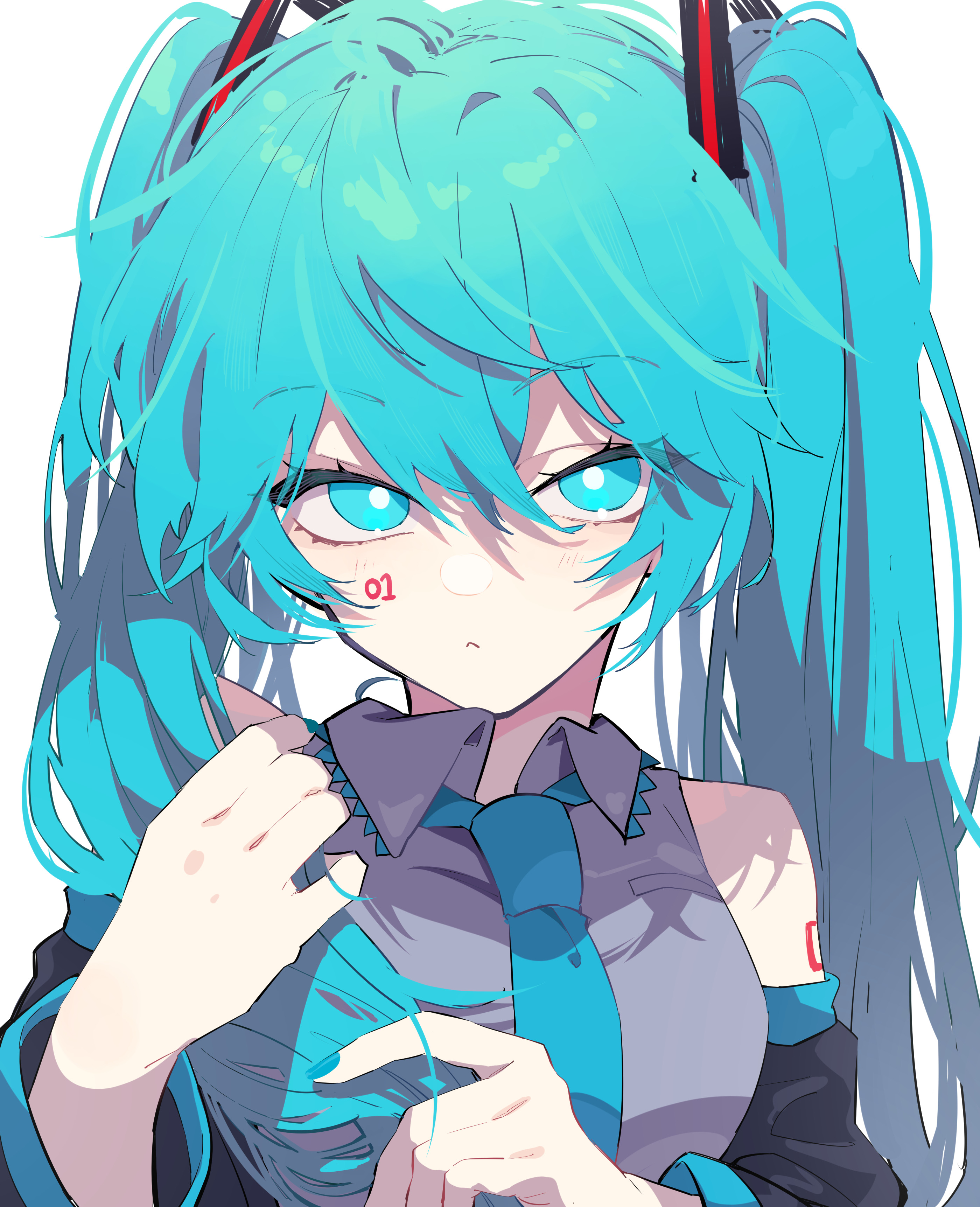 1girlblue eyesblue hairblue nailsblue necktieblushbright pupilscollared shirtdetached sleeveseyelashesfrowngrey shirthair between eyeslong hairlooking at viewernecktieshirtshoulder tattoosimple backgroundsleevelesssleeveless shirtsolotattootwintailsupper bodywhite backgroundwhite pupils
