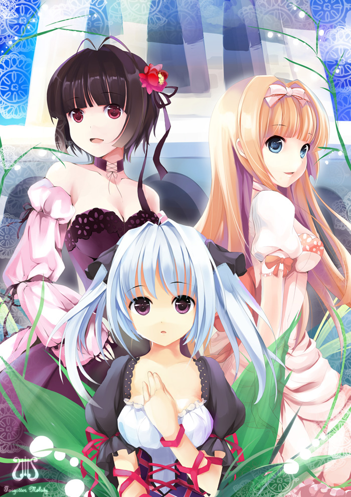 3girlsantenna hairbare shouldersblonde hairblue eyesblue hairbowbreastsbrown haircleavagedetached sleevesdressflowerhair bowhair flowerhair ornamenthair ribbonlong hairmedium breastsmultiple girlspurple eyesred eyesribbonshort hairtwintails