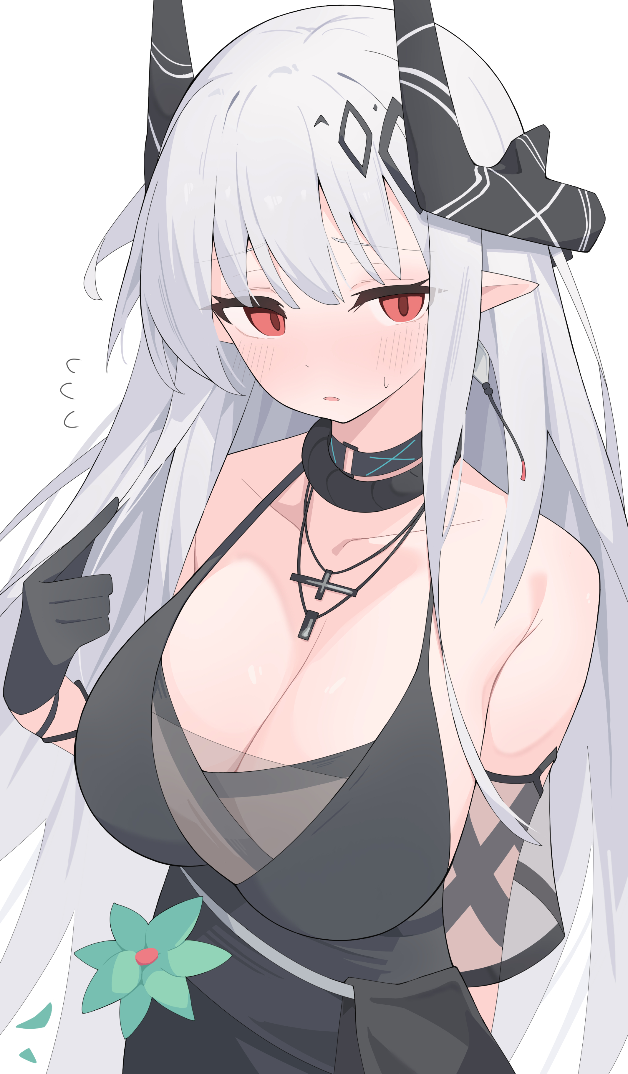 1girlblack chokerblack dressblack glovesblack hornsblushbreastschokercleavagecollarbonedressglovesgrey hairhornshuge breastsjewelrylong hairlooking at viewernecklaceopen mouthpointy earsred eyessimple backgroundsolowhite background