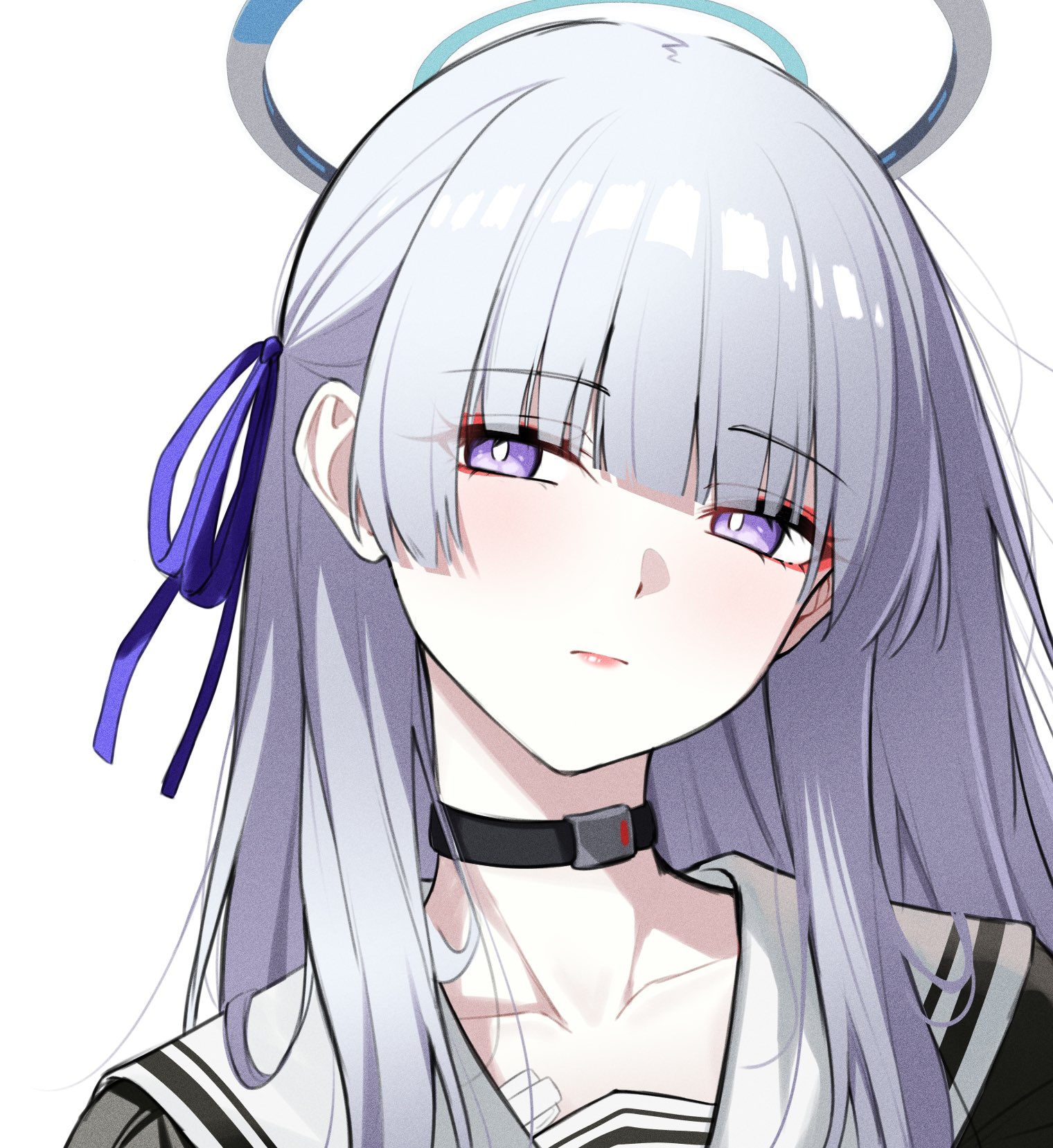 1girlblack chokerblunt bangsbright pupilschisa (wuthering waves) (cosplay)chokerclosed mouthcollarbonecosplayeyelinergrey hairhair ribbonhalolong hairlooking at viewermakeupmolemole under eyeportraitpurple eyespurple ribbonred eyelinerribbonsailor collarsimple backgroundsolowhite backgroundwhite pupilswhite sailor collar