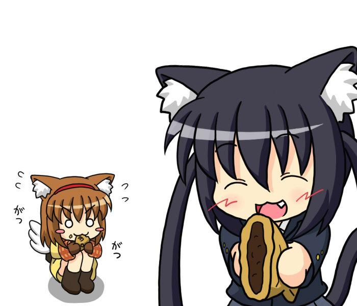 00s2girlsanimal earsbackpackbagblack hairbootsbrown haircat earschibiclosed eyescrossovereatingfoodhairbandkemonomimi modelong hairmittensmultiple girlsrandoseruschool uniformsharing foodshort hairtaiyakitwintailswagashiwings
